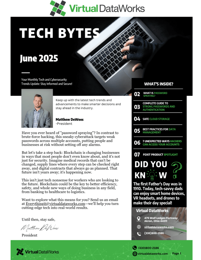 Welcome to the June edition of the Tech Bytes Newsletter! This month, explore the latest in technology and cybersecurity. Learn about the importance of cloud storage, understand password spraying, discover best practices for data management, and get expert advice on strong passwords and authentication. Stay updated with Virtual DataWorks by your side. Read More!