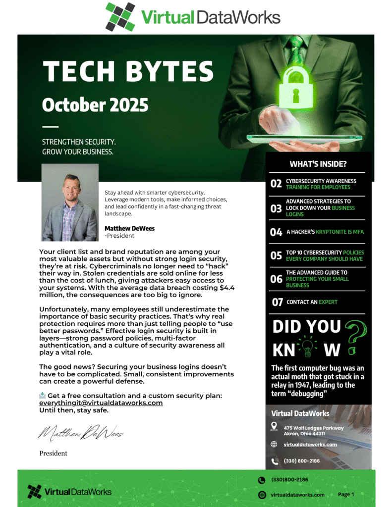 Welcome to the October Edition of Tech Bytes!This month, we’re spotlighting cutting-edge innovations in technology and cybersecurity. Explore the Top 10 Cybersecurity Policies every company should implement, uncover the Hackers’ Kryptonite, empower your team with Cybersecurity Training, and dive into our Advanced Guide to Securing Small Business Logins. Read More!