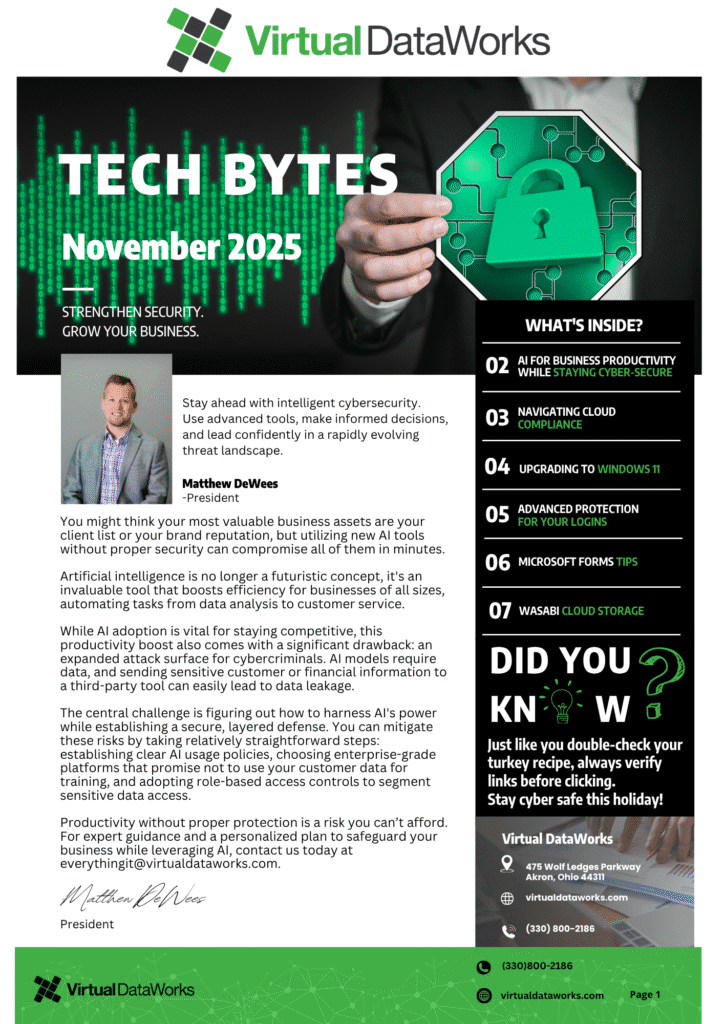 Welcome to the November Edition of Tech Bytes! This month, we’re highlighting transformative developments in technology and cybersecurity. Learn how to stay secure while enhancing productivity with AI, navigate the complexities of Cloud compliance, explore advanced login protection strategies, empower your team with Microsoft Forms best practices, and discover the benefits of Cloud Storage with…