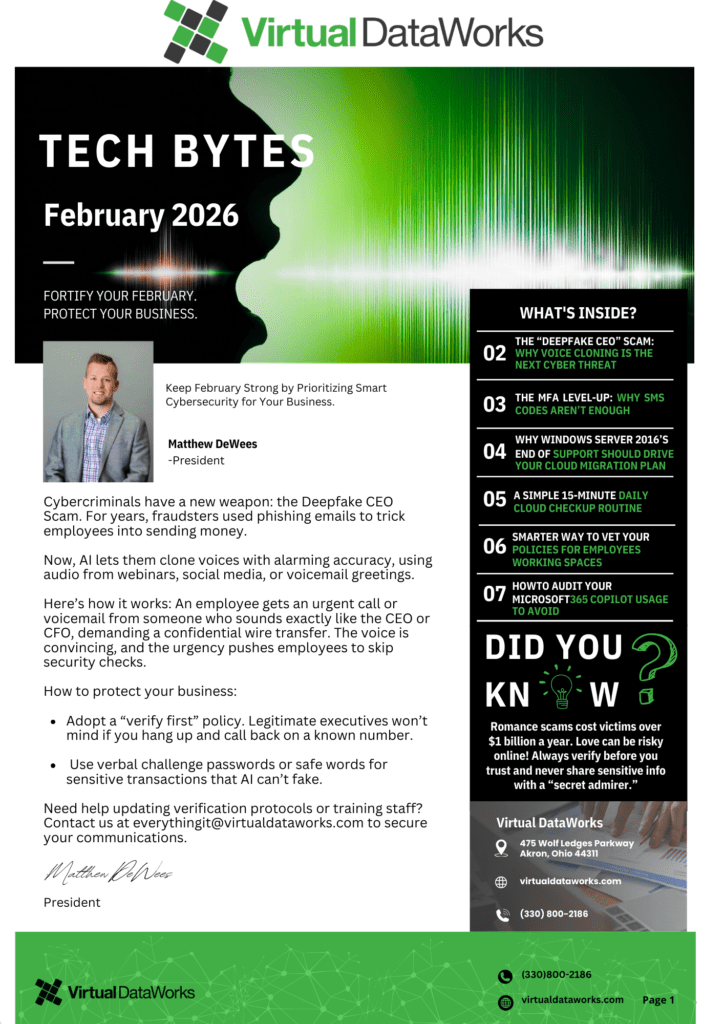 February Tech Bytes: Elevate Your Security and Efficiency in 2026This month’s edition highlights essential strategies to strengthen security and enhance operational resilience. Inside, we explore conducting Microsoft 365 Copilot audits, securing third-party workspaces, uncovering the risks of the “Deep Fake CEO” scam, and practical ways to elevate your multi-factor authentication (MFA). Read More!